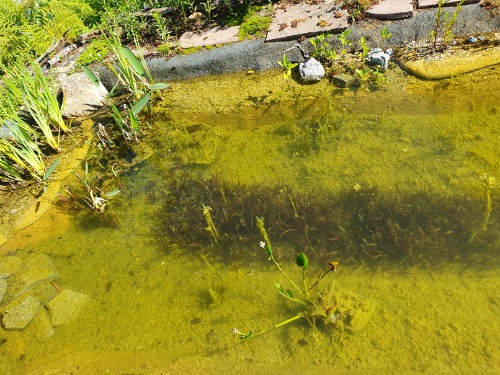 Wie man außerdem sieht, entwickeln sich unsere Pflanzen gaaaaanz schlecht. Wir haben zweimal nachgepflanzt, auch mal was versucht, z.B. mit Pflanzkörben. Alles was außerhalb des Wassers wächst entwickelt sich prächtig, im Wasser schlecht, wie man sieht.